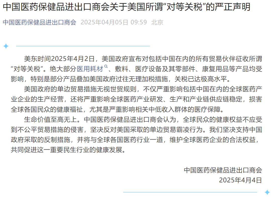 中国医药保健品进出口商会就美征收所谓“对等关税”一事发表严正声明称,美东时间2025年4月2日,美国政府宣布对包括中国在内的所有贸易伙伴征收所谓“对等关税”。绝大部分医用耗材、敷料、医疗设备及其零部件、康复用品等产品均受影响,特别是部分产品叠加美国政府过往无理加税措施,关税已达极高水平。