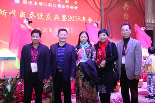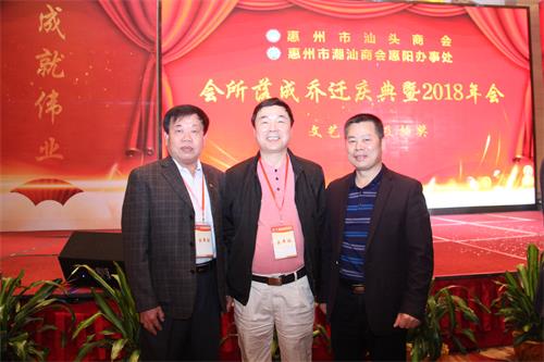 2019年1月16日,我会会长庄金项、执行会长方创荣、理事方惠江、林瑞香、林耿在、郑宏城、会员方秀凤、秘书长方振逵、副秘书长方惜芳一行9人赴大亚湾华美达酒店,应邀出席惠州市汕头商会第一届第四次、惠州市潮汕商会惠阳办事处第二届第四次会员大会暨会所落成乔迁庆典, 出席本次大会活动的领导有惠州市民政局副局长何顾全, 惠州市社会组织管理局局长邓文汉、副局长农丽芬, 惠州市工商联党组成员、秘书长詹宏, 惠州市社会组织总会会长钟新伟, 惠阳区民政局党组书记林晓宏, 惠阳区宣传部副部长、社科联主席卢舜辉, 惠阳区工商联(总商会)主席、以及本市各潮属社团和部分友好商协会会长、会员共近四百人出席大会活动, 庆典由CCTV《大国人文》李红梅主持。