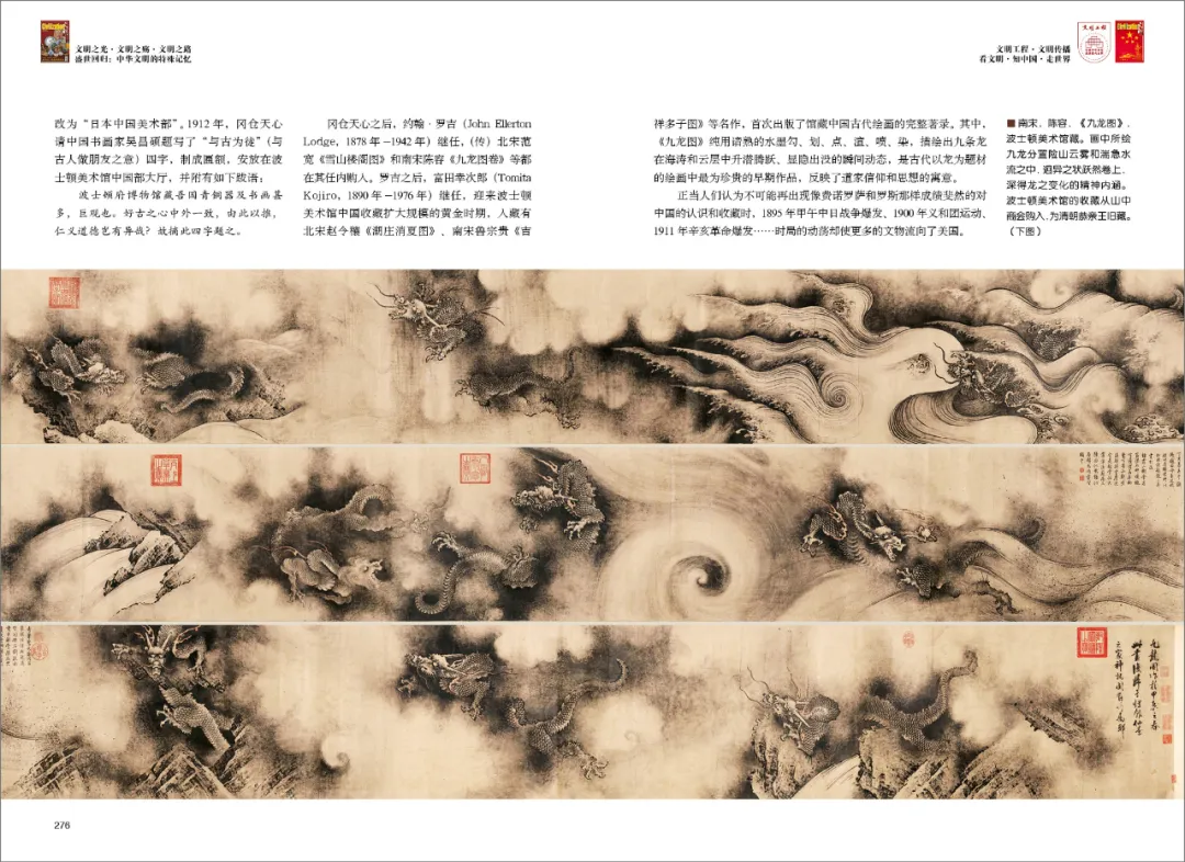冈仓天心之后,约翰·罗吉继任,(传)北宋范宽《雪山楼阁图》和南宋陈容《九龙图卷》等都在其任内购入。罗吉之后,富田幸次郎继任,迎来波士顿美术馆中国收藏扩大规模的黄金时期,入藏有北宋赵令穰《湖庄消夏图》、南宋鲁宗贵《吉祥多子图》等名作,首次出版了馆藏中国古代绘画的完整著录。其中,《九龙图》纯用谙熟的水墨勾、划、点、渲、喷、染,描绘出九条龙在海涛和云层中升潜腾跃、显隐出没的瞬间动态,是古代以龙为题材的绘画中最为珍贵的早期作品,反映了道家信仰和思想的寓意。