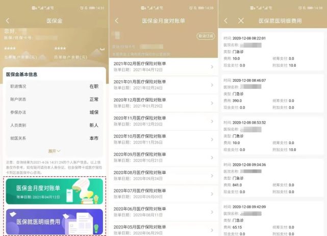 点击“医保金”页面下方的“医保金月度对账单”,可查询每月医保金的缴纳情况和金额。点击“医保就医明细费用”,可查看就医付费信息。