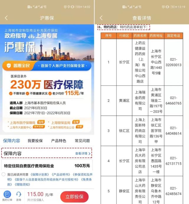 答:在上海市二级及以上医院门诊或上海市具备销售药品资质的药店可购买和使用《特定高额药品目录》中药品。如在产品说明书所附《特约药店清单》购买特定高额药品,可享受特药直付和送药上门服务。特药药店信息,点击“保障内容”旁边的“查看详情”可获取药店信息: