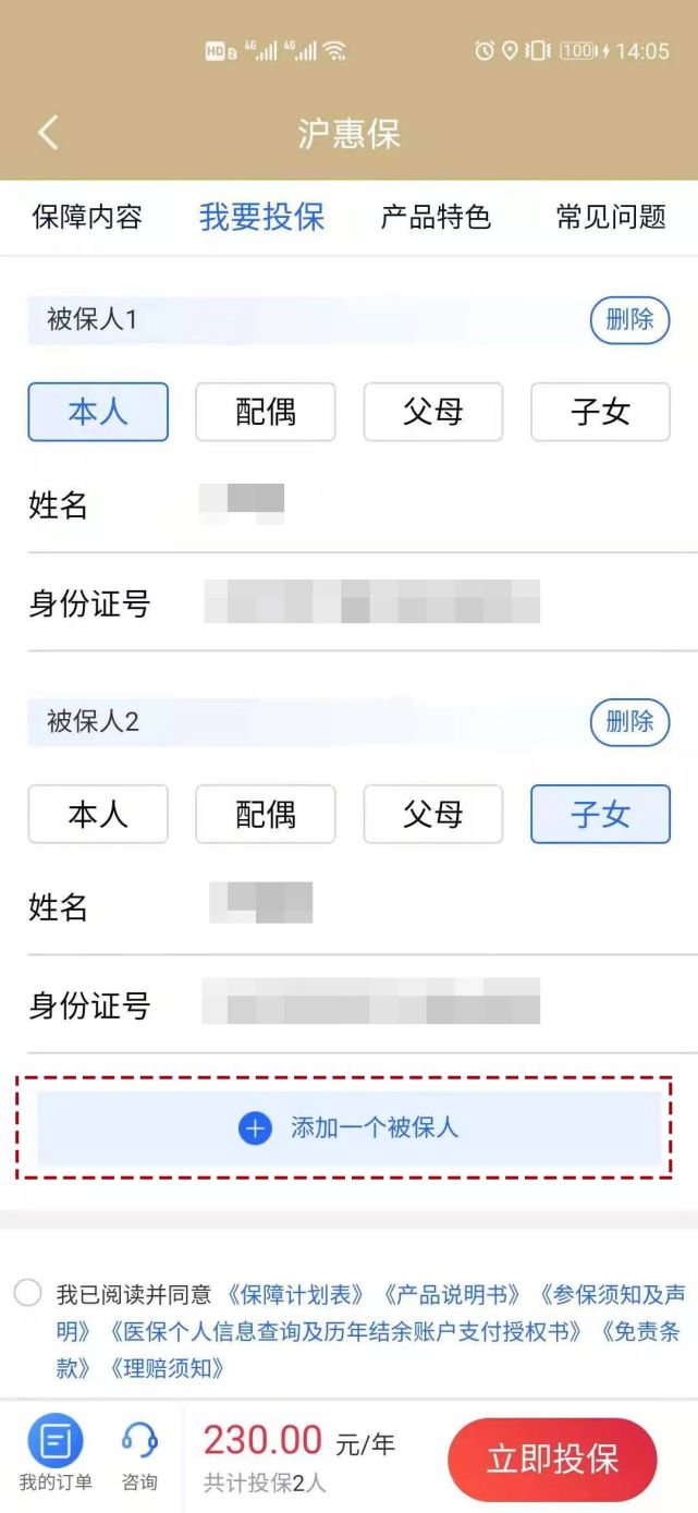 3、填写投保信息:点击“添加一个被保人”,可同时为自己及5位家人(直系亲属:父母、子女、配偶)投保