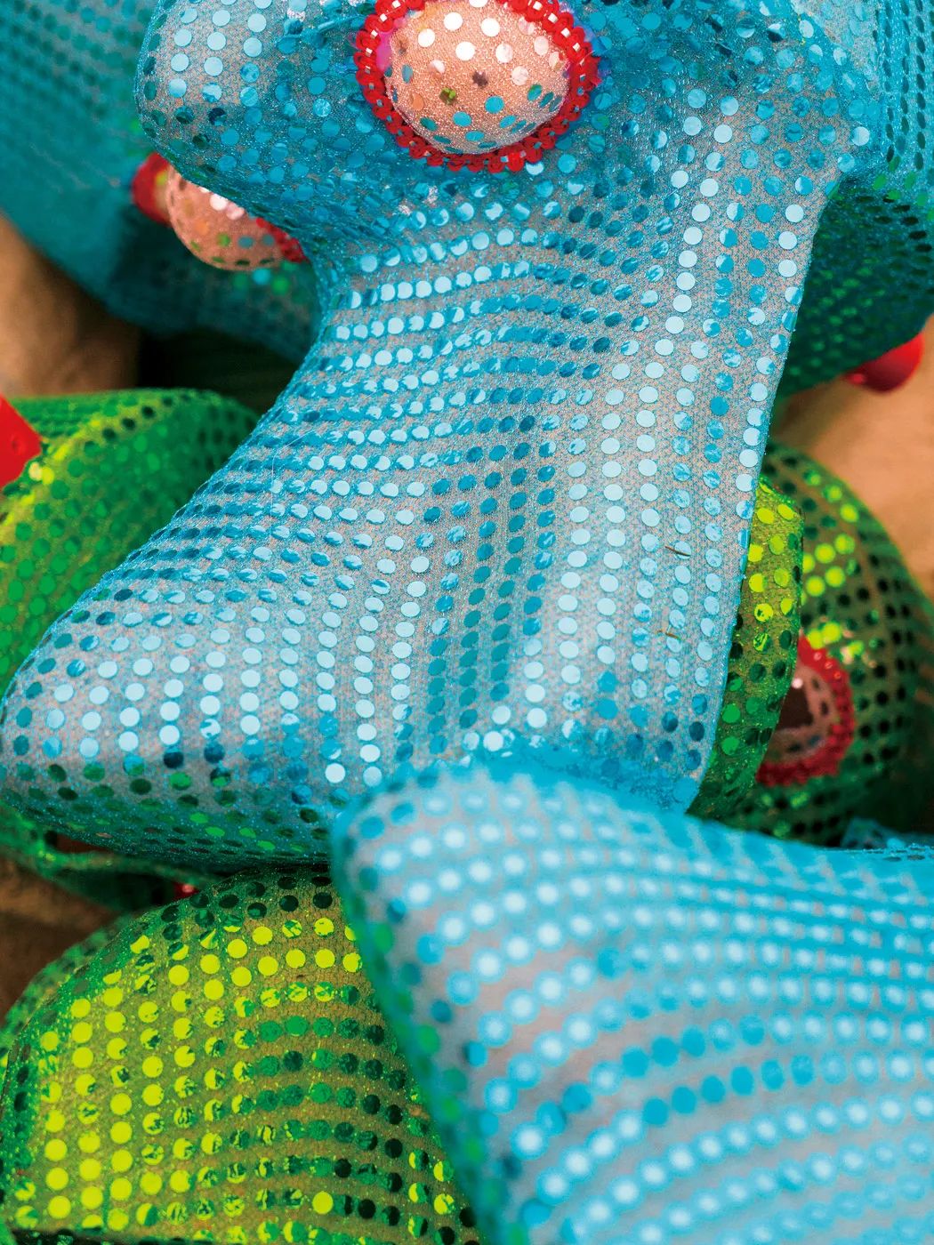 在舞龙制作专业户陈天宝家的库房里,各色社火龙产品依墙而立,有的比他还高。“这些年,舞龙产品不断更迭,‘社火发烧友’的品位也越来越高。”他扶着一款通身会亮的新产品说,这个“夜光舞龙”是专门为社火夜间表演设计的。