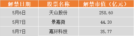 具体来看,天山股份5月6日将解禁52.88亿股,为定向增发机构配售股份;景嘉微5月7日将解禁0.64亿股,为定向增发机构配售股份;嘉环科技5月7日将解禁2.18亿股,为首发原股东限售股份。