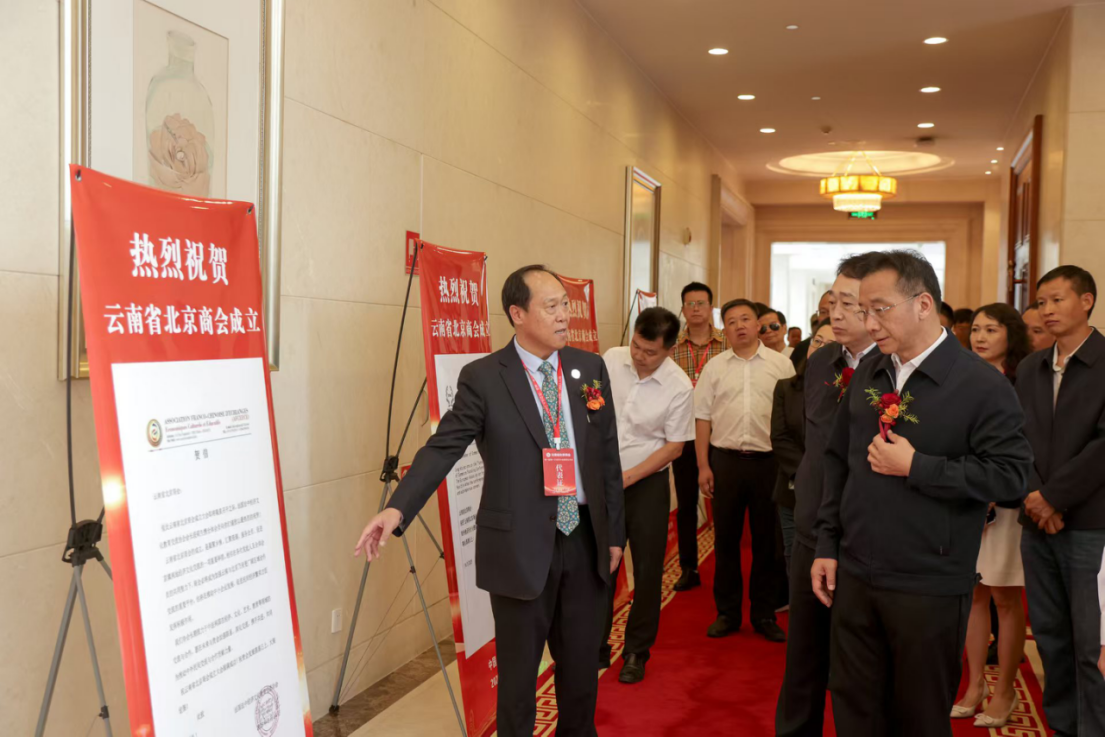 ▲云南省委统战部、省委社会工作部、省民政厅、省工商联、省投资促进局等相关部门负责人以及北京市工商界等机构代表共同为商会揭牌。