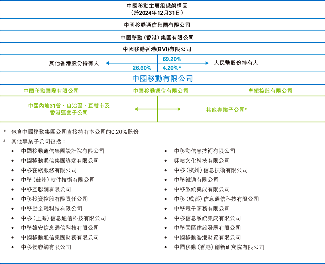 本公司的最终控股股东是中国移动通信集团有限公司(简称「中国移动集团公司」)。于2024年12月31日,该集团直接和间接持有本公司约69.40%的已发行总股数,余下约30.60%由公众股东持有。