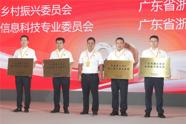 (会长吴松喜分别为广东省浙江商会乡村振兴委员会、广东省浙江商会粤港澳浙籍企业家联盟、广东省浙江商会信息科技专业委员会、广东省浙江商会低空经济委员会颁发牌匾。)