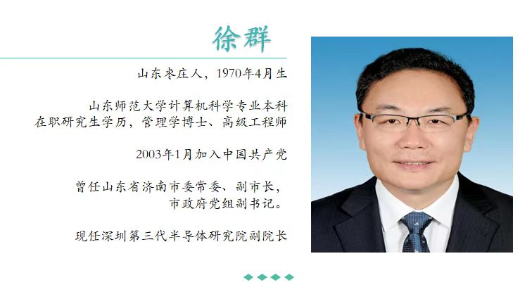 徐群,曾任山东济南市委常委、副市长、市政府党组副书记,现任深圳第三代半导体研究院副院长。