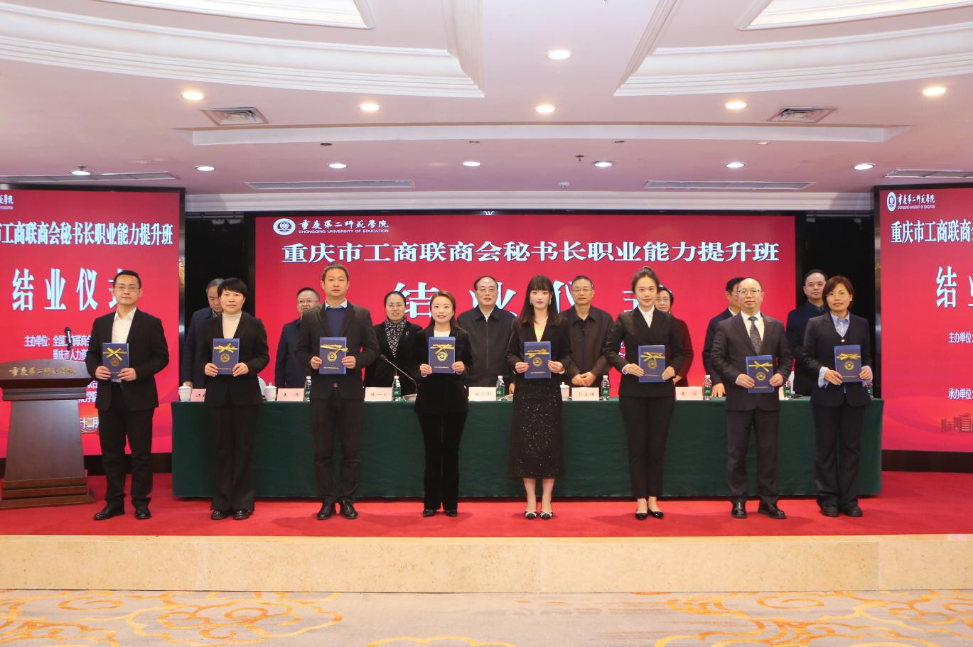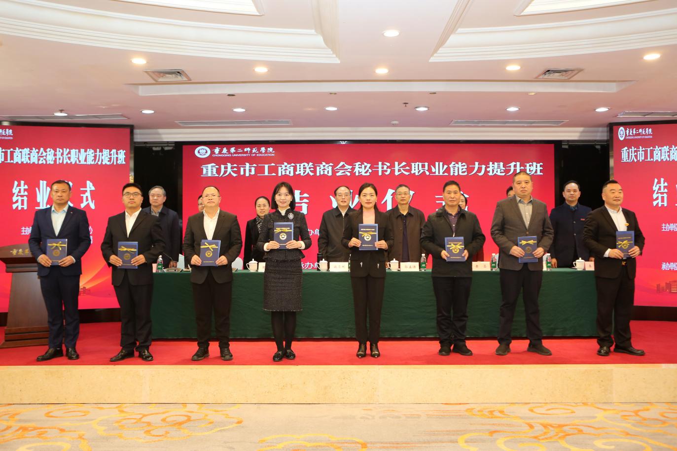 为深化行业协会商会改革,提升工商联商会秘书处人员职业能力,12月23日-27日,由全国工商联商会发展服务中心、市工商联、市人社局、市民政局联合主办的重庆市工商联商会秘书长职业能力提升班在重庆市第二师范学院成功举办。在结业仪式上,颁发全国工商联首批商会专业人员资格证书以及由市工商联、市人社局、市民政局联合颁发的商协会专职人员能力证书。