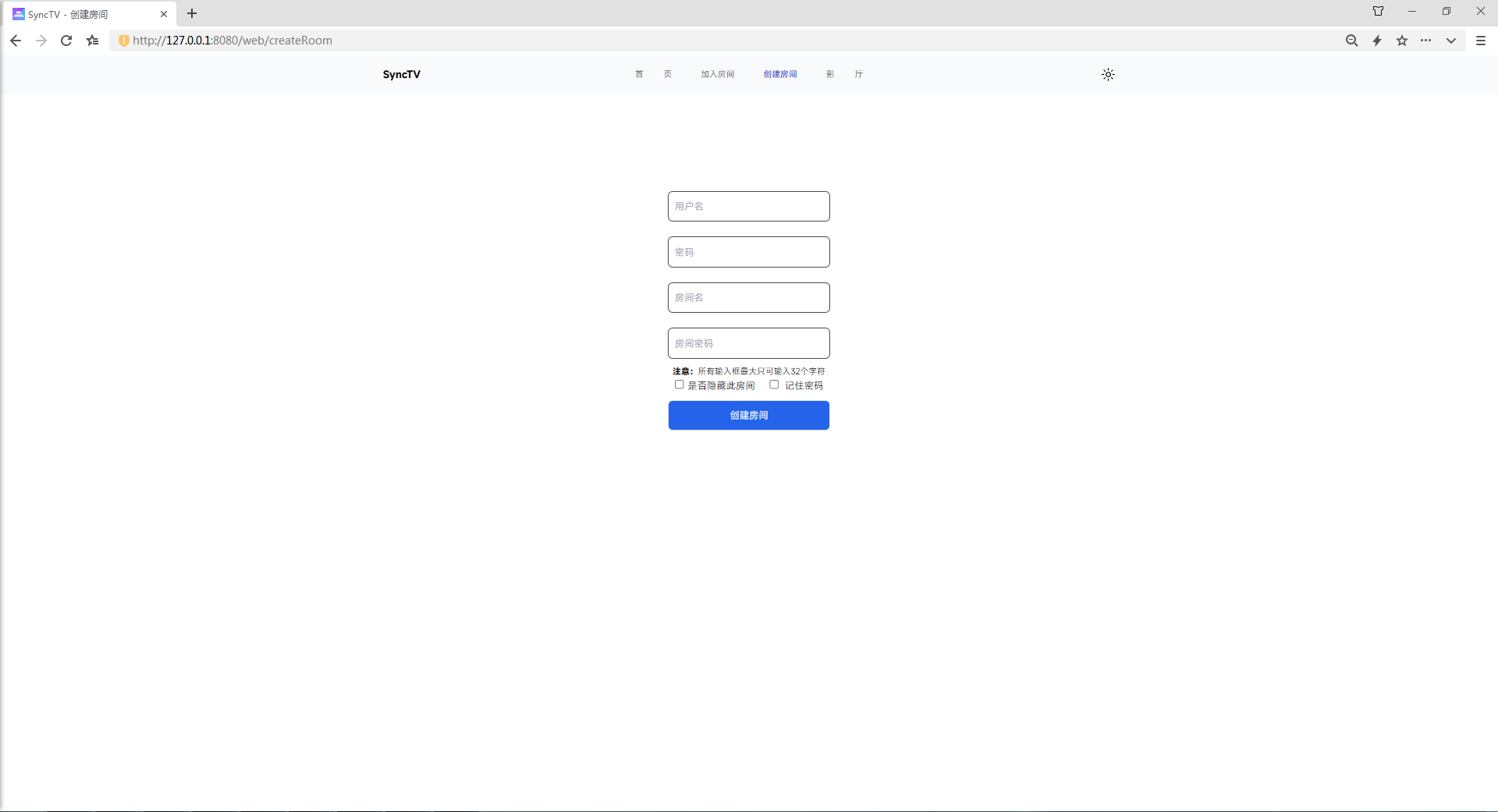 启动_synctv.vbs Dim ws Set ws = Wscript.CreateObject("Wscript.Shell") ws.run "synctv-windows-amd64.exe server -f ./config.yaml",vbhide Wscript.quit 停止_synctv.vbs Dim ws Set ws = Wscript.CreateObject("Wscript.Shell") ws.run "taskkill /f /im synctv-windows-amd64.exe",0 Wscript.quit 0x4 亲自体验教程我们运行后进来十分简洁,顶部能看到 首页、加入房间、创建房间、影厅 没有多余的选项