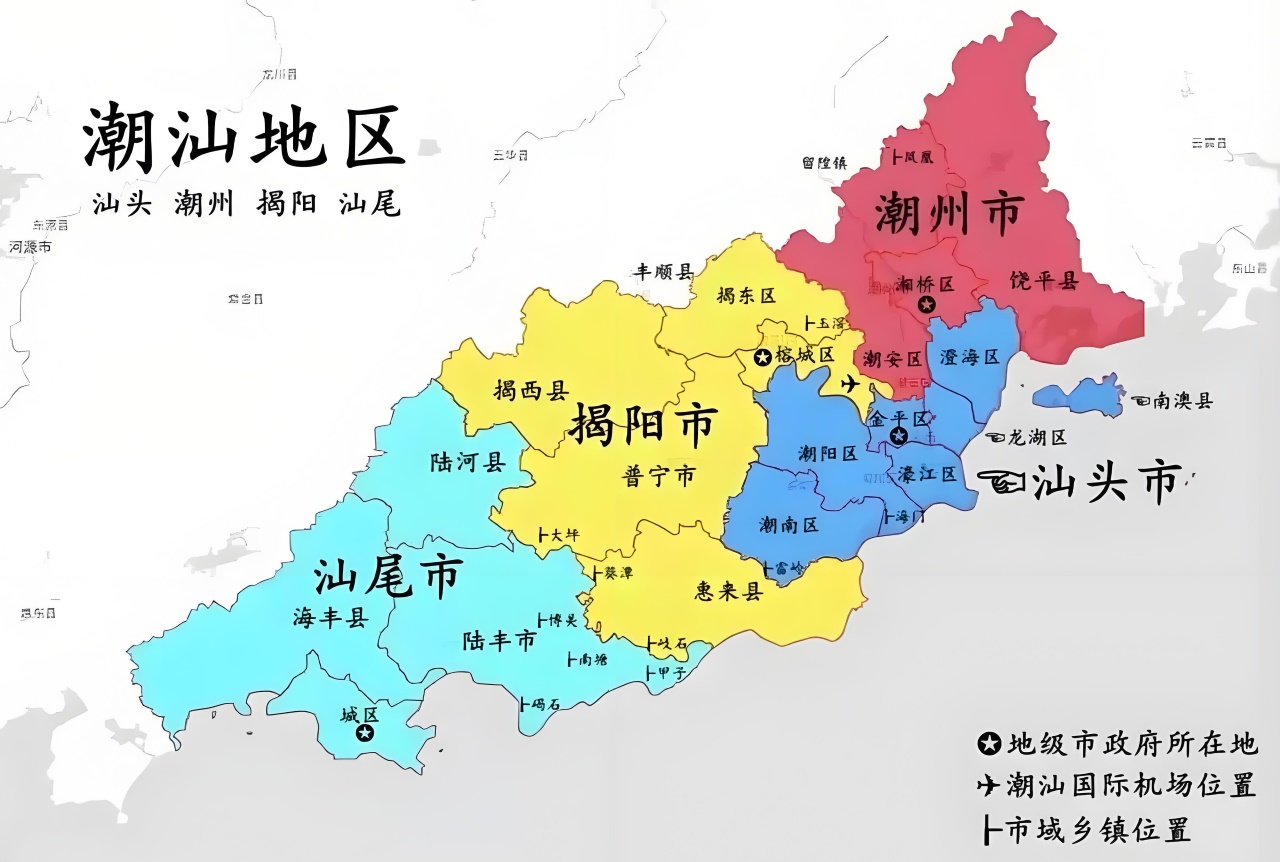 潮汕并非单一城市,而是广东省东部的一个地理文化区域,涵盖潮州、汕头、揭阳三个地级市(历史上统称“潮州八邑”),总面积10346平方公里,常住人口超1364万。这里山海交融、人文荟萃,是岭南文化的重要发源地,也是联合国教科文组织认定的“潮人祖地”。下面一起来看看潮汕三市简介以及实用旅行指南。