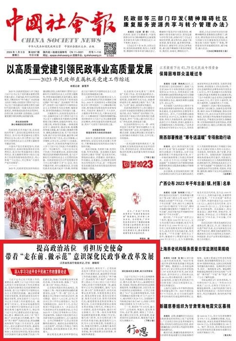 1月3日出版的《中国社会报》头版“深入学习习近平关于民政工作的重要论述”栏目,刊登江苏省民政厅党组书记、厅长谢晓军署名文章《提高政治站位 勇担历史使命 带着“走在前、做示范”意识深化民政事业改革发展》,谈学习认识体会,谋下一步贯彻落实举措。全文如下: