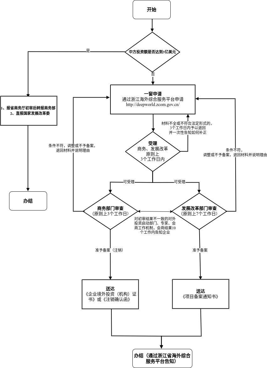 1.商务部门:中方投资额3亿美元(含)以上,由省商务厅转报商务部征求意见,并在取得同意后备案;1000万美元(含)—3亿美元和特殊情形由省商务厅备案;1000万美元以下由各设区市及义乌市商务局备案。