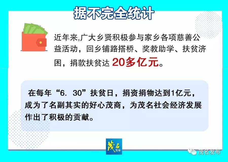 ▶高州籍乡贤刘恒智几年来捐赠家乡公益事业达1000多万元。电白籍乡贤郑龙辉多次支持家乡公益事业或资助乡亲累计超过千万元。