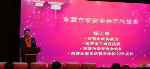 大会开始,政协第八届东营市委员会委员、东营市工商联执委、东营金盾司法学校书记、校长,东营市泰安商会会长杨万里致欢迎词并作商会年终报告,回顾了一年来商会在党建引领、文化育人、教育树人、志愿服务、精准扶贫等领域所取得的成绩,并对2020年商会工作进行了规划。