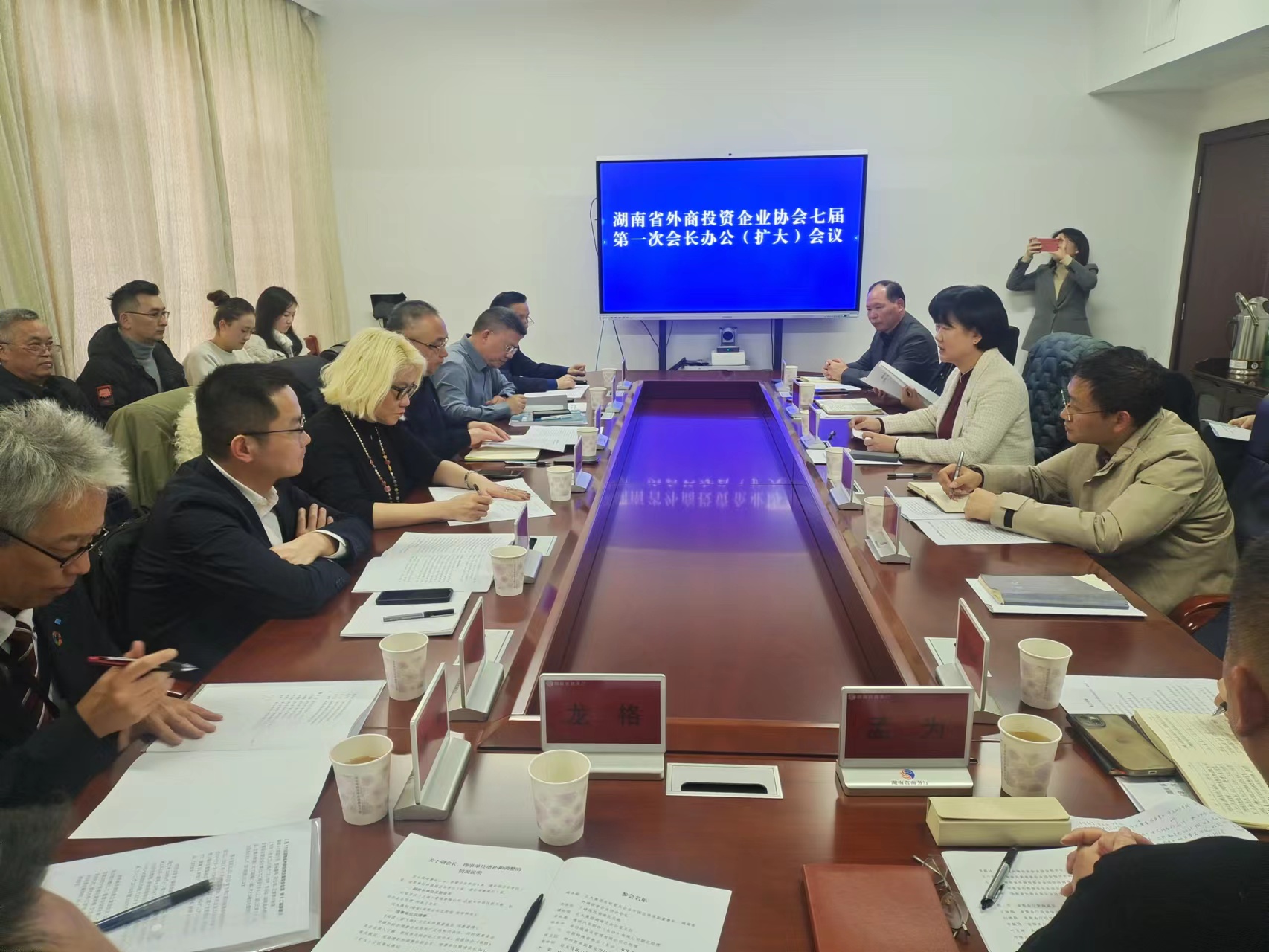 117午,为充分发挥协会作用精准服务外商投资企业,外商投资企业协会七届一次会长办公会(扩大)会议在省商务厅召开郭宁副厅长出席座谈会。会议由湖南省商务服务中心副主任叶文琳主持,厅投资促进处、投资管理处、园区开放处、省商务服务中心、湖南省外商投资协会相关负责人参会。