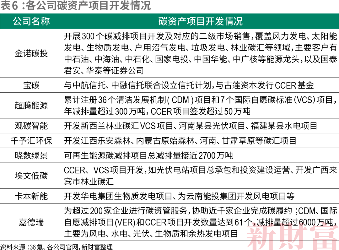 以金诺碳投为例,其主要接受排控企业的委托,代其进行资产申报和签发,同时与拥有风电、光伏、林业、湿地等资源方合作开发CCER及国际自愿减排项目,并负责二级市场的包销(表6)。目前,其已累计完成6000万吨CCER和CEA交易,交易金额超过30亿元。