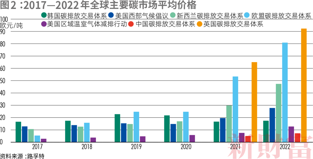 根据路孚特数据,2022年,全球碳市场的碳配额交易量达到125亿吨,我国交易量仅占4‰。对比来看,我国发放的碳配额是欧盟的3倍,然而,欧盟的碳交易额却达到了7514.59亿欧元,若以最新汇率计算,我国交易额不及欧盟的10%。