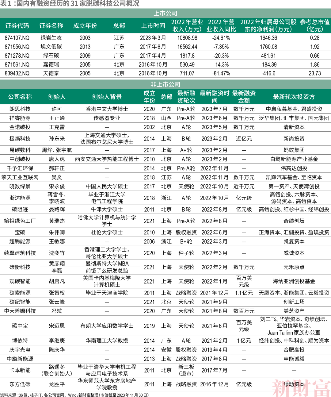 新财富盘点发现,国内有融资经历的脱碳科技公司已达31家,其中,能够提供第一、二、三类服务的公司分别为19家、18家、18家,有12家可以覆盖全部三类服务(表1)。