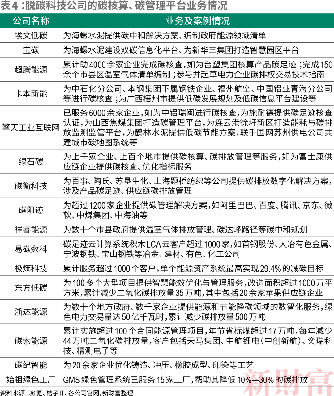 在这一领域,头部企业的客户量已以千为单位。公开资料显示,擎天工业互联网的SaaS解决方案已服务6000余家企业;超腾能源助4000余家企业完成碳核查;碳阻迹为超过1200家企业提供碳管理解决方案;绿石碳为上千家企业、上百个地市提供碳核算、碳排放管理等服务;易碳数科的积木LCA云客户超过1000家(表4)。