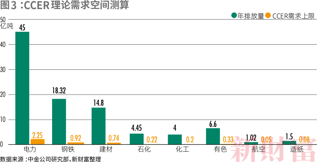 供需缺口扩大,是这一市场重启的主要原因。据统计,全国碳市场第一个履约期结束时,约6000万吨的CCER已被抵消,占已签发减排量的75%左右,剩余签发减排量已不足2000万吨。同时,若以5%为CCER抵消比例上限,且电力、钢铁、建材、石化、化工、有色、造纸、航空八大重点排放行业全部纳入碳市场,则CCER年需求量将达到4.78亿吨(图3)。