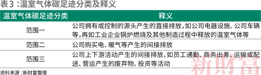 对于一家企业而言,其温室气体足迹来源于三大范围:范围一为公司拥有或控制的源头产生的直接排放;范围二为公司购买电、暖气等产生的间接排放,于普通公司而言,外购电力是这一范围的最大排放源;范围三包含了公司上下游活动产生的间接排放,是企业碳排放总量中占比最高,也最难识别与筛查的一部分(表3)。