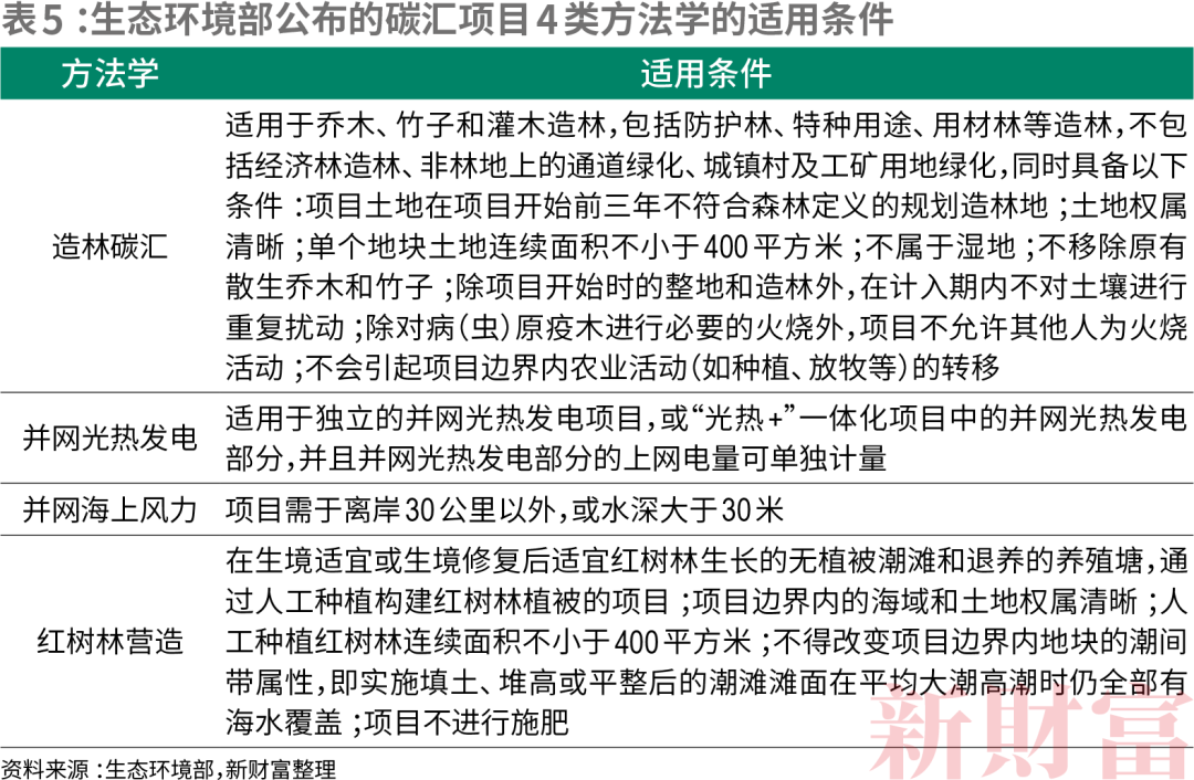 那么,是否随便一片红树林或森林都可以开发成CCER项目用以出售?从生态环境部公布的4类方法学来看,碳汇项目对原本土地条件有严格的要求(表5)。