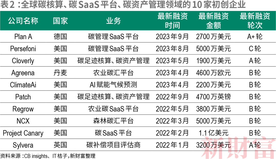 中国脱碳科技初创公司的崛起背后,是全球这一赛道融资加速,碳核算、碳SaaS平台、碳资产管理领域的10家全球领先企业,融资额几乎全部过亿(表2)。