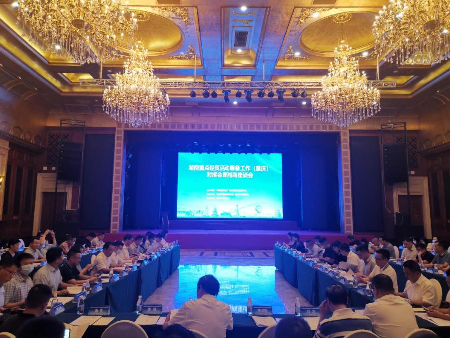7月22日下午,2022年湖南省重点经贸活动筹备工作(重庆)对接会暨湘商座谈会在重庆召开。省商务厅党组书记、厅长沈裕谋出席并讲话,厅一级巡视员、省商务服务中心主任毛七星主持会议。岳阳、张家界、永州、怀化等市州商务主管部门负责人以及来自湖南异地商会联合会、重庆市、四川省、贵州省湖南商会、渝川黔各异地湖南商会和重庆市山东、甘肃、北京、四川等兄弟省份商会的100余名代表参会。