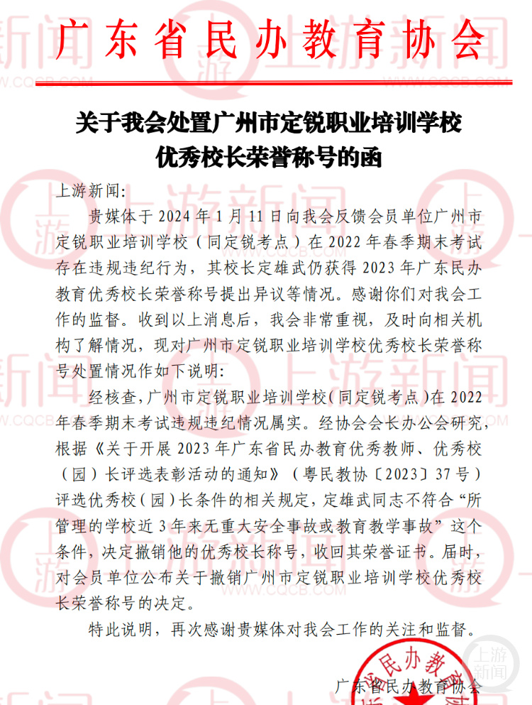 1月22日,广东省民办教育协会回应记者:“经核查,广州市定锐职业培训学校(定锐考点)在 2022年春季期末考试违规违纪情况属实。经协会会长办公会研究,根据《关于开展2023年广东省民办教育优秀教师、优秀校(园)长评选表彰活动的通知》(粤民教协〔2023〕37 号)评选优秀校(园)长条件的相关规定,定雄武同志不符合‘所管理的学校近3年来无重大安全事故或教育教学事故’这个条件,决定撤销他的优秀校长称号,收回其荣誉证书。届时,对会员单位公布关于撤销广州市定锐职业培训学校优秀校长荣誉称号的决定。”