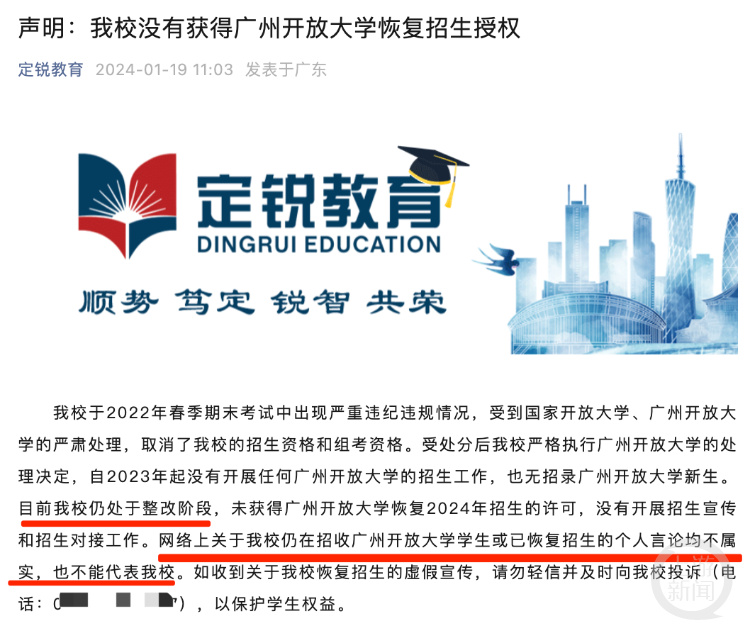 1月19日,定锐考点在其官方公众号“定锐教育”发布的《我校没有获得广州开放大学恢复招生授权》声明称:“我校于2022年春季期末考试中出现严重违纪违规情况,受到国家开放大学、广州开放大学的严肃处理,取消了我校的招生资格和组考资格。受处分后我校严格执行广州开放大学的处理决定,自2023年起没有开展任何广州开放大学的招生工作,也无招录广州开放大学新生。目前我校仍处于整改阶段,未获得广州开放大学恢复2024年招生的许可,没有开展招生宣传和招生对接工作。网络上关于我校仍在招收广州开放大学学生或已恢复招生的个人言论均不属实,也不能代表我校。如收到关于我校恢复招生的虚假宣传,请勿轻信并及时向我校投诉。”
