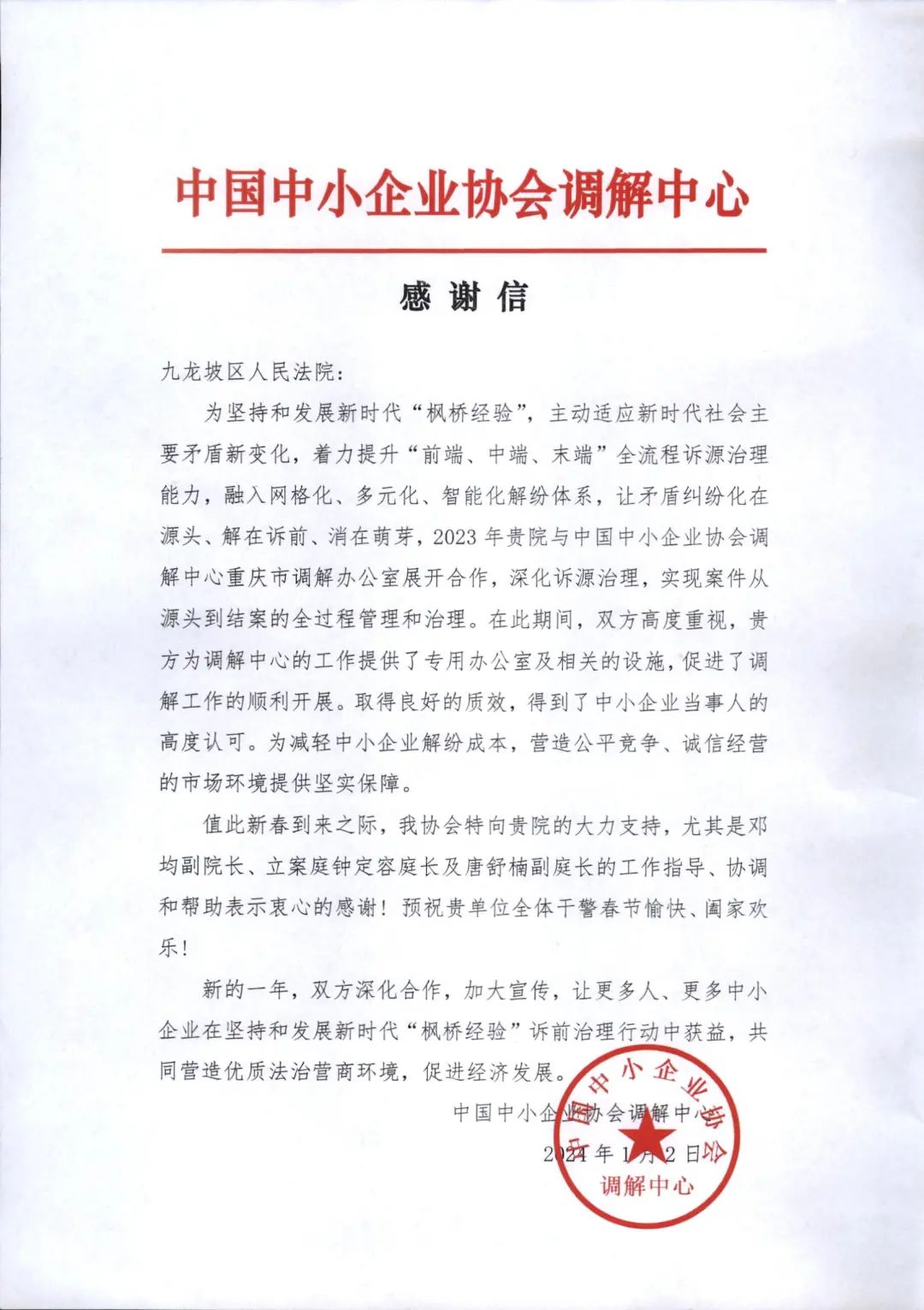 “贵院为调解中心开展调解工作提供了专用办公室及相关设施,促进了调解工作顺利开展。为减轻中小企业解纷成本,营造公平竞争、诚信经营的市场环境提供了坚实保障,调解工作得到了中小企业当事人高度认可。在此,我们向贵院协调、支持和指导调解中心调解工作表示衷心感谢!”2024年1月,中国中小企业协会调解中心向九龙坡法院发来一封感谢信。