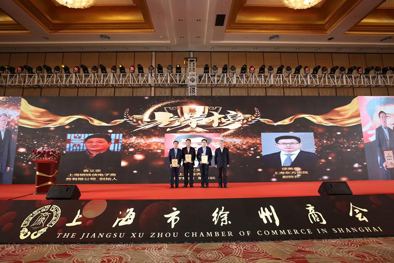 上海市人民对外友好协会会长沙海林为获得最具影响力奖的上海徐州商会常务副会长袁义宗、上海徐州商会副会长朱义文、上海东方医院副院长徐美东颁发奖牌。