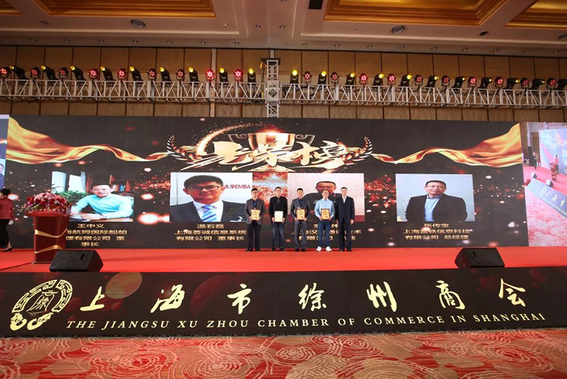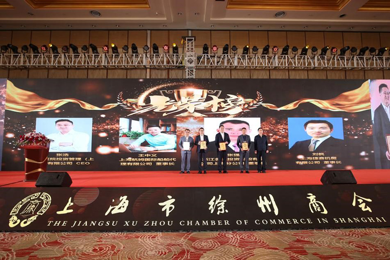 江苏省政府驻沪办主任王建康为获得创新发展奖的上海徐州商会副会长王中义、上海徐州商会副会长温石磊、上海徐州商会理事刘献伟、上海徐州商会理事张传宝颁发奖牌。