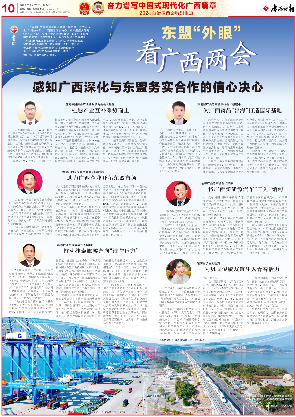 新闻眼“做活广西高质量发展这盘棋,棋眼就在扩大开放上。”新的一年,广西坚定信心决心,牢牢把握大好的“时”与“势”,持续扩大对内对外开放,积极打造国内国际双循环市场经营便利地。政府工作报告明确提出“持续深化与东盟务实合作”,让作为特邀贵宾的东盟侨商侨领深感振奋,信心满怀。近日,广西日报记者采访了部分东盟侨商侨领以及越南留学生,记录他们对广西两会的感知,传递他们与广西携手共进的愿景。