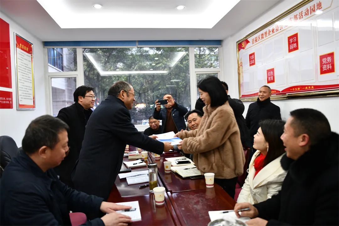 孙养统一行首先参观“微企之家”、微企协会的支部阵地室,详细了解微企协会的组织架构、成员组成、运行管理等情况,向微企协会赠送涪陵法院精心编写的《民营企业法律风险防控提示书》,详细介绍涪陵法院在服务保障企业、优化法治化营商环境方面的工作举措,了解小微企业在生产经营活动中的司法需求及对法院工作的意见建议。