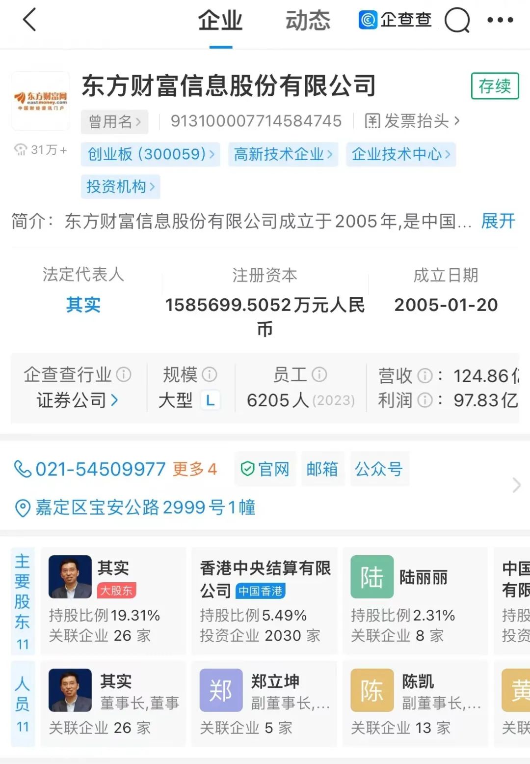 据企查查显示,其实在东方财富的持股比例为19.31%,按东方财富目前的市值计算,其身家达到了401.7亿元。