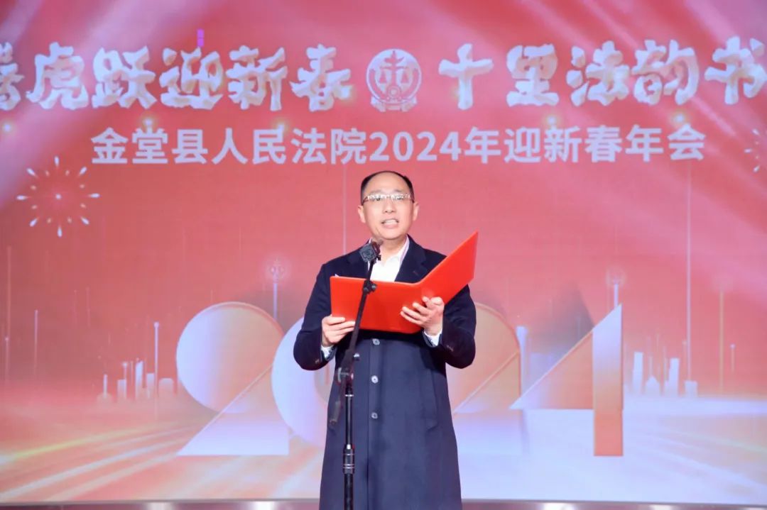 龙腾虎跃迎新春,十里法韵书金心。在年会正式开始前,党组书记、院长徐文波代表院党组向一直以来关心支持金堂法院的各位老领导、老同事、老朋友,向全体干警、工作人员及家属们致以节日的问候,祝愿大家新年愉快、阖家幸福!