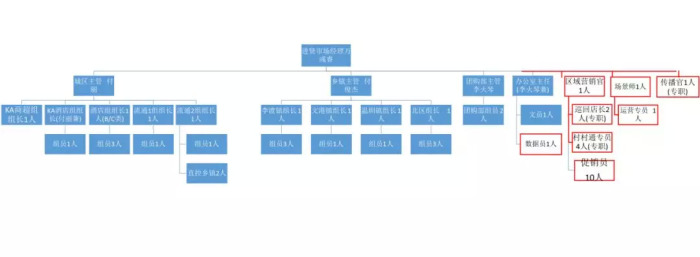 李渡的区域市场组织架构,共分为两大板块。其中蓝色部分为销售岗位,专职负责网点开发、订单获取、基础客情维护、销售管理等传统的渠道端工作,负责“销”;红色部分为营销岗位,专职负责活动策划、活动开展、消费者的获取和运营、品牌策划和推广、核心终端深度维护等“营”的工作。
