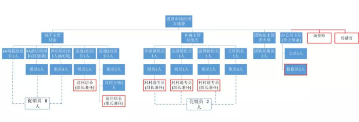 巡回店长:设置2人编制,由城区2个流通小组组长兼任,主要负责核心终端客情维护、氛围布置、活动执行、终端背后团购资源挖掘等工作。