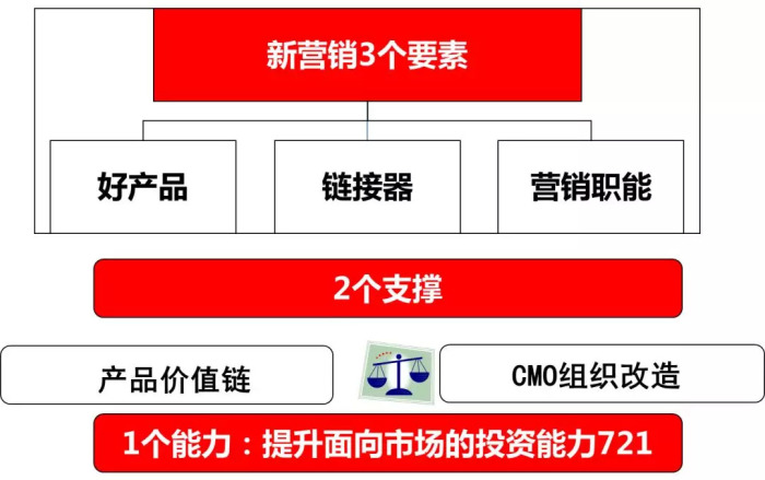 这就构成了笔者提出的新营销123法则:1个面向市场的投资目标—721,2个支撑点——CMO组织和产品价值链设计,3个要素——好产品、链接器、营销职能。如下图: