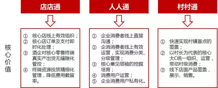 笔者为李渡导入三通工程,分别是“店店通”“人人通”“村村通”。其中店店通是打通“厂商店”三位一体的渠道数字化改造工程,让供给端的渠道在线化和数字化,人人通是针对消费用户的链接,村村通是对农村的意见领袖进行链接。如图所示: