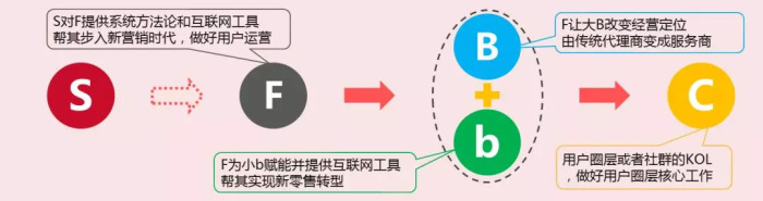 渠道层面进入C链B链相通、线上线上融合的新营销阶段:品牌商借助移动互联的工具,为下游经销商和零售商赋能,在让经销商和零售商交易在线化后,三者形成真正一体化关系,然后共同链接消费用户、运营消费用户,最终形成渠道数字化和消费用户的私有化,彻底解决用户失联的问题。如下图所示: