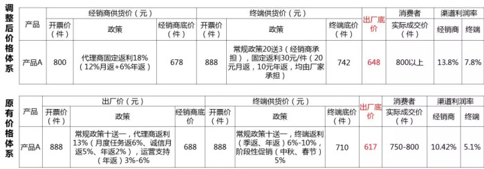 厂商合作过程中,产品市场政策有裸价、半控价、全控价三种方式,新营销需要企业全控价,这样手中有“子弹”(资源)做用户运营。很多厂家产品价格处于倒挂、穿底状态,需要进行调整。