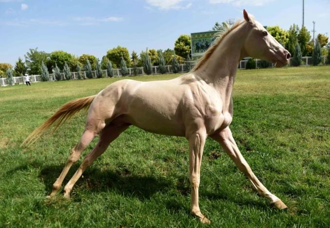 这是2016年8月26日在土库曼斯坦阿什哈巴德拍摄的一匹阿哈尔捷金马。在中国历史文献中,阿哈尔捷金马被称为“天马”,据说史书中的“汗血马”即源自阿哈尔捷金马。新华社记者 罗晓光 摄