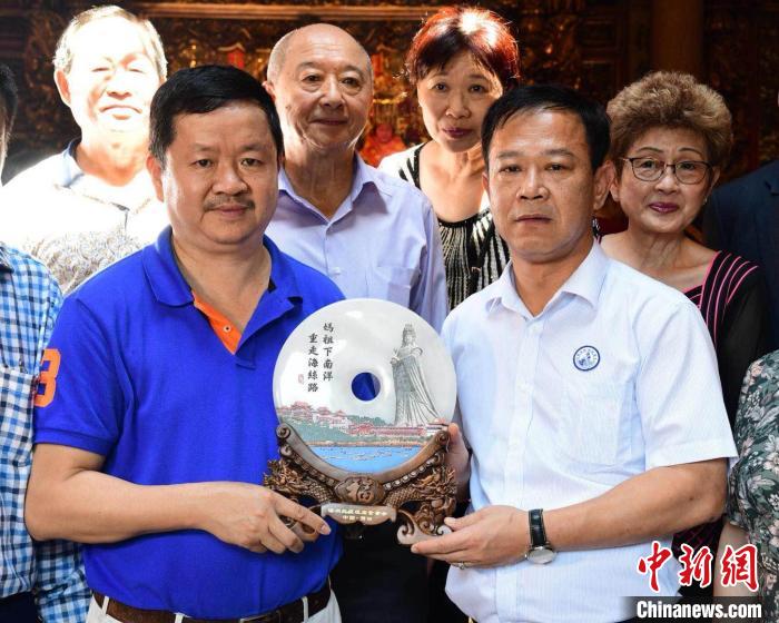 2018年9月,戴秉凡(左)率领澳大利亚莆田商会、澳大利亚悉尼天后宫、澳大利亚妈祖文化协会二十多人前往湄洲妈祖祖庙,恭请妈祖分灵澳大利亚带领旅澳华侨二十五人赴福建湄洲妈祖祖庙,恭请金身妈祖神像来悉尼,图为湄洲祖庙董事长林金赞(右)赠送礼品。受访者供图