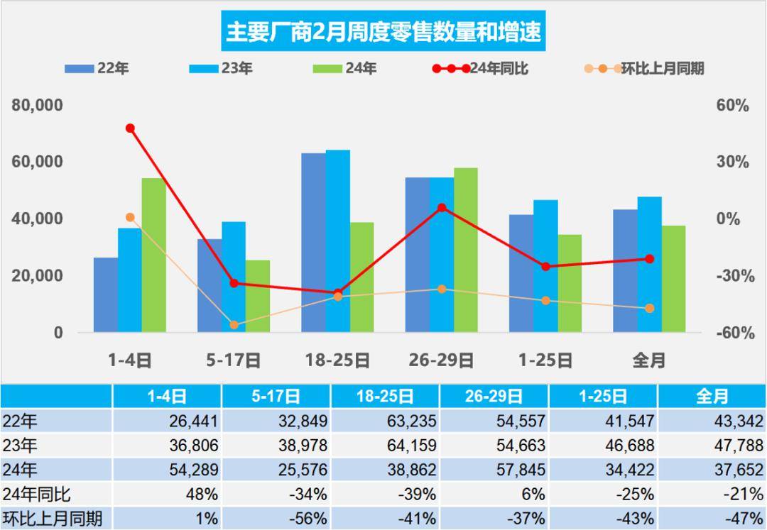 2月第四周全国乘用车市场日均零售3.9万辆,同比去年2月同期下降39%,环比上月同期下降41%。
