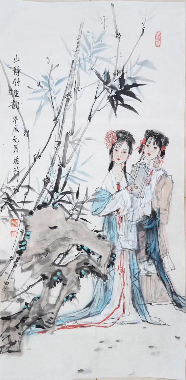 “我叫冷珍,是山东女书画家协会的副主席,今天非常荣幸能到文化世界来,这不是第一次,以前我和爱人一块儿来过,我的绘画主要是表现女性题材为主,既有古代女性,更多是现代女性,包括少数民族女性、女军人、健康知识分子女孩等等。我今天画的两位‘女神’是古代女性,通常定义为仕女,配景为青竹和赏石。”