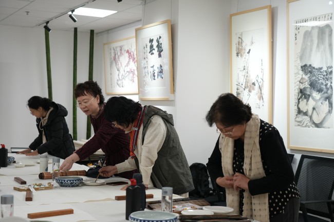 在两网编辑部回顾了主席王小晖教授的历年佳作,八位画家便一同来到“云间画室”挥毫落墨。八人同时现场创作,对“云间画室”来说是规模最大的一次,但对八位“女神”来说却是日常的娱乐,她们互相借鉴,边画边聊,欢声笑语不绝于耳,画室里就像飞进来许多叽叽喳喳的喜鹊,笑着闹着提醒我们春天的到来。她们聊得有书画界的趣闻轶事,也有自家的家长里短,王主席还邀请大家放歌一曲,并告诉我们,在画室里大家一边画画一边唱歌,是女画家们的保留节目。