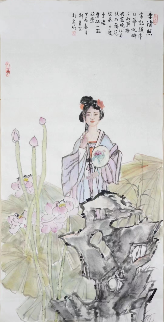 画中,李清照亭亭玉立,站在藕花深处,执扇微笑,风神绰约。刘爰说,李清照不但是中国的历史文化名人,她的词更是享誉世界文坛,更重要的是“她是我们济南人!”作画的时候,各位画家们还一起热情地“吃瓜”李清照的“八卦”:“李清照别看是个才女,别以为是文文静静的光会读书写词,她可不是个‘省油的灯’,不但爱喝酒,经常喝醉,还爱打牌,牌技也是一流,真是把日子过得丰富多彩!”大家哄堂大笑。